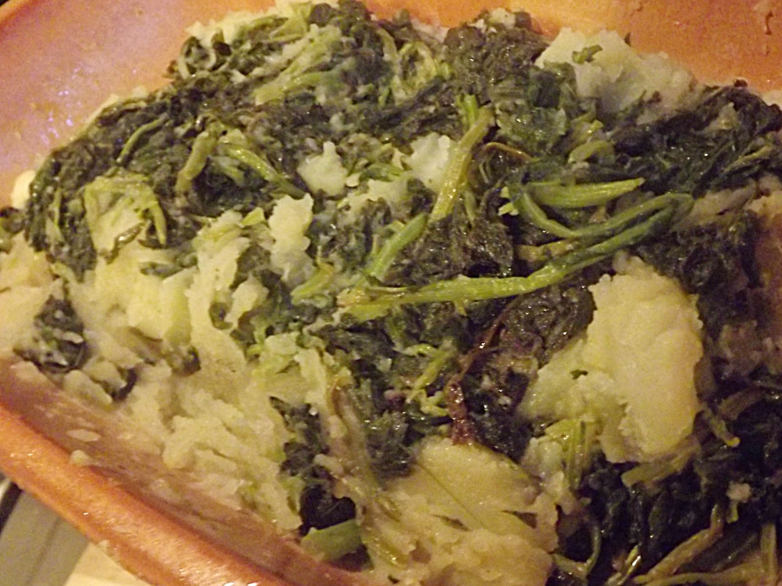 INGREDIENTI: patate, foglie di cime di rapa, verze, erbette aromatiche, foglie di tarasacco (cicuriòn), 1 spicchio d'aglio, olio d'oliva, sale, pepe. PROCEDIMENTO: pulire e mondare le verdure e le patate e lessarle separatamente. In una padella mettere l'aglio interno ed un poco d'olio, e dopo pochi minuti unire le verdure e le patate. Lasciare rosolare. Con un cucchiaio di legno mescolare delicatamente per tutta la cottura, a formare un tortino croccante da ambo le parti.